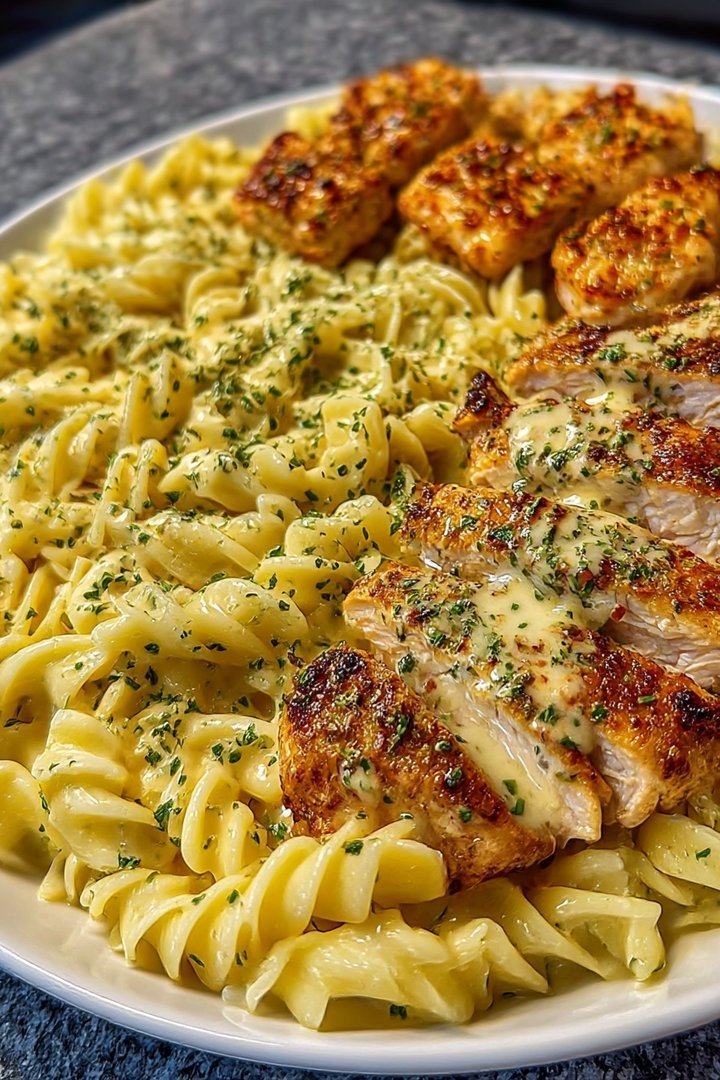 Creamy Garlic Parmesan Chicken with Cheesy Twisted Pasta
