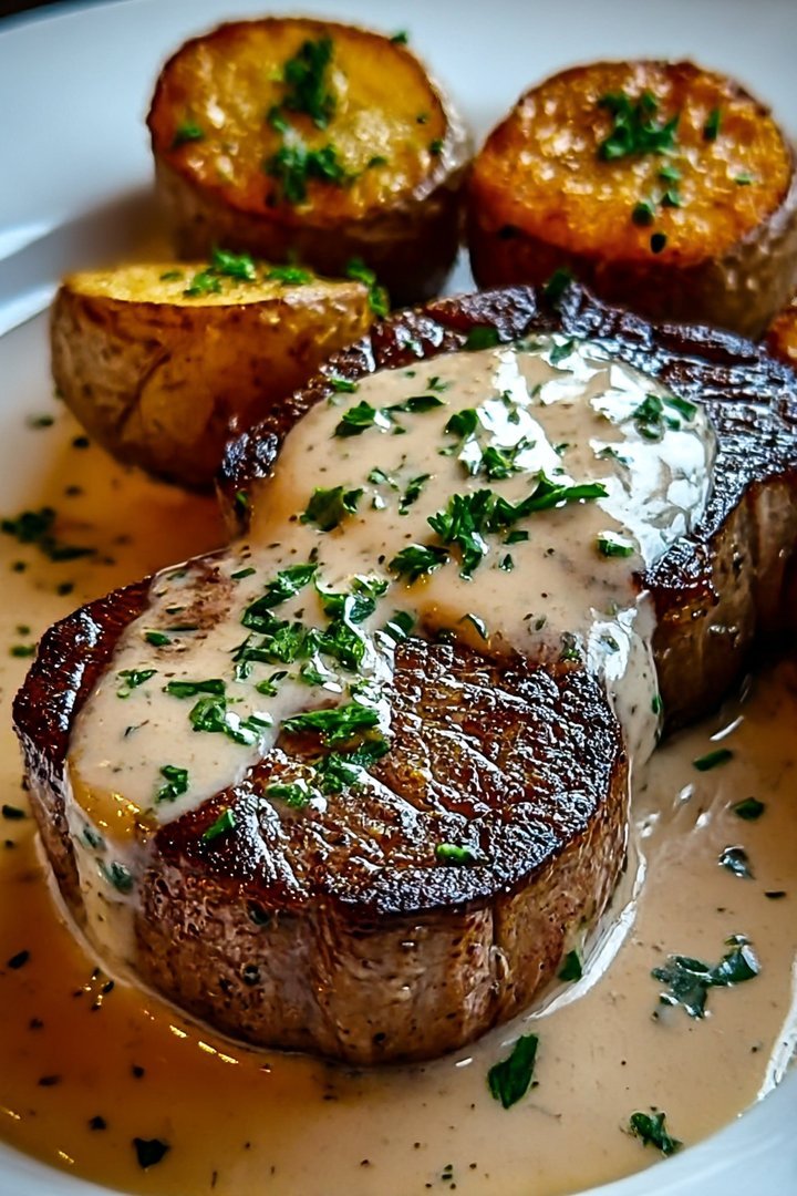 Steak with Haunted Peach nectar with vanilla Garlic Cream Sauce