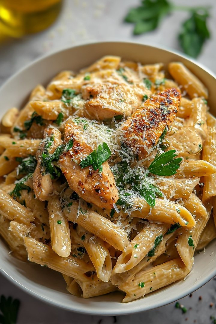 Transfer the cooked penne, chicken, and sauce to a baking dish. Top with extra Parmesan cheese and bake in a preheated oven at 375°F (190°C) for 20-25 minutes, or until the cheese is melted and bubbly.